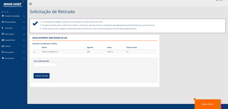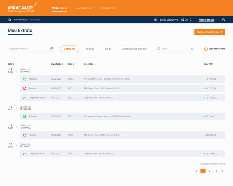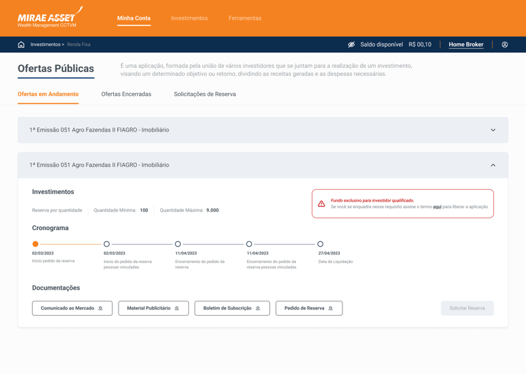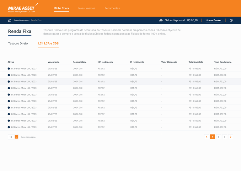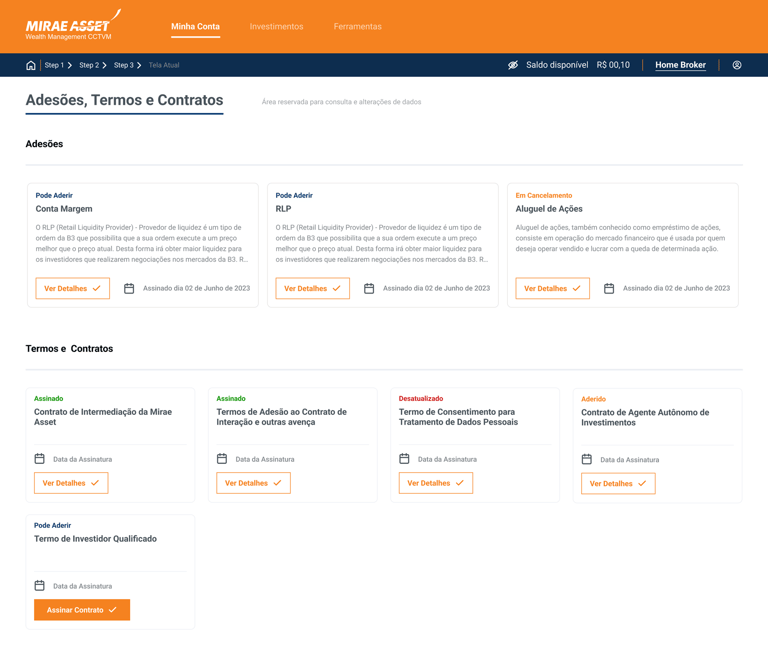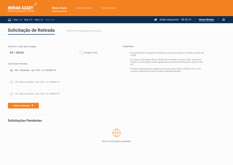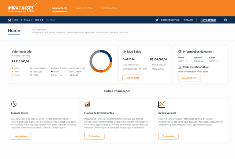 A Mirae possui um home broker próprio que facilita muito o acesso para investidores e assessores, onde era pouco explorado e com um design menos intuitivo esse área de dificil navegação, acessibilidade e baixa fluidez.